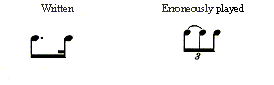 The solution is to call the attention of the ensemble to the mathematics of the situation by using a blackboard to divide the quarter note into four equal parts. Then count slowly 1-2-3-4 for each subdivision. The opposite problem occurs in playing swing music. In the case of the latter, a literal rendition of the notes would sound too mechanical.