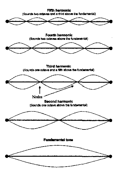 In mathematical terms we may say that the frequency of each harmonic is in inverse proportion to the size of the fraction. This means that the vibration of equal halves of a string produces double the frequency of the whole (and thus sounds an octave higher), the vibration of equal thirds triples the frequency (and therefore sounds an octave and a fifth higher than the fundamental note) and so on. The range of notes so produced is called the harmonic series.