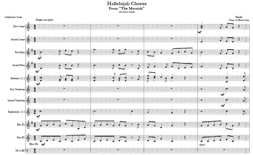 Hallelujah (Brass Band). I have recently (June 30, 2008) made some minor corrections to the brass band score, adding a soprano cornet part as well. You can download the brass ensemble music (which includes bass clef parts)